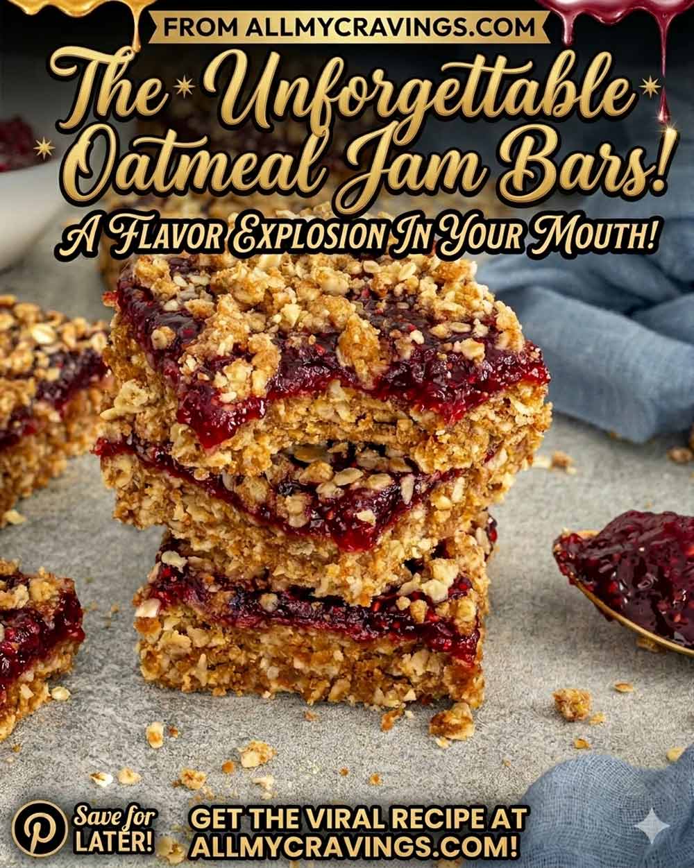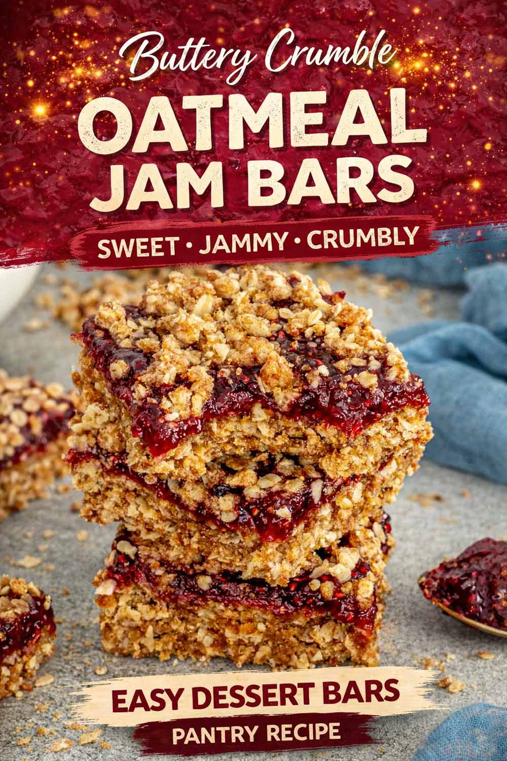 Tall stack of raspberry oatmeal jam bars surrounded by crumbs, with jam spoon and crumpled blue napkin nearby.